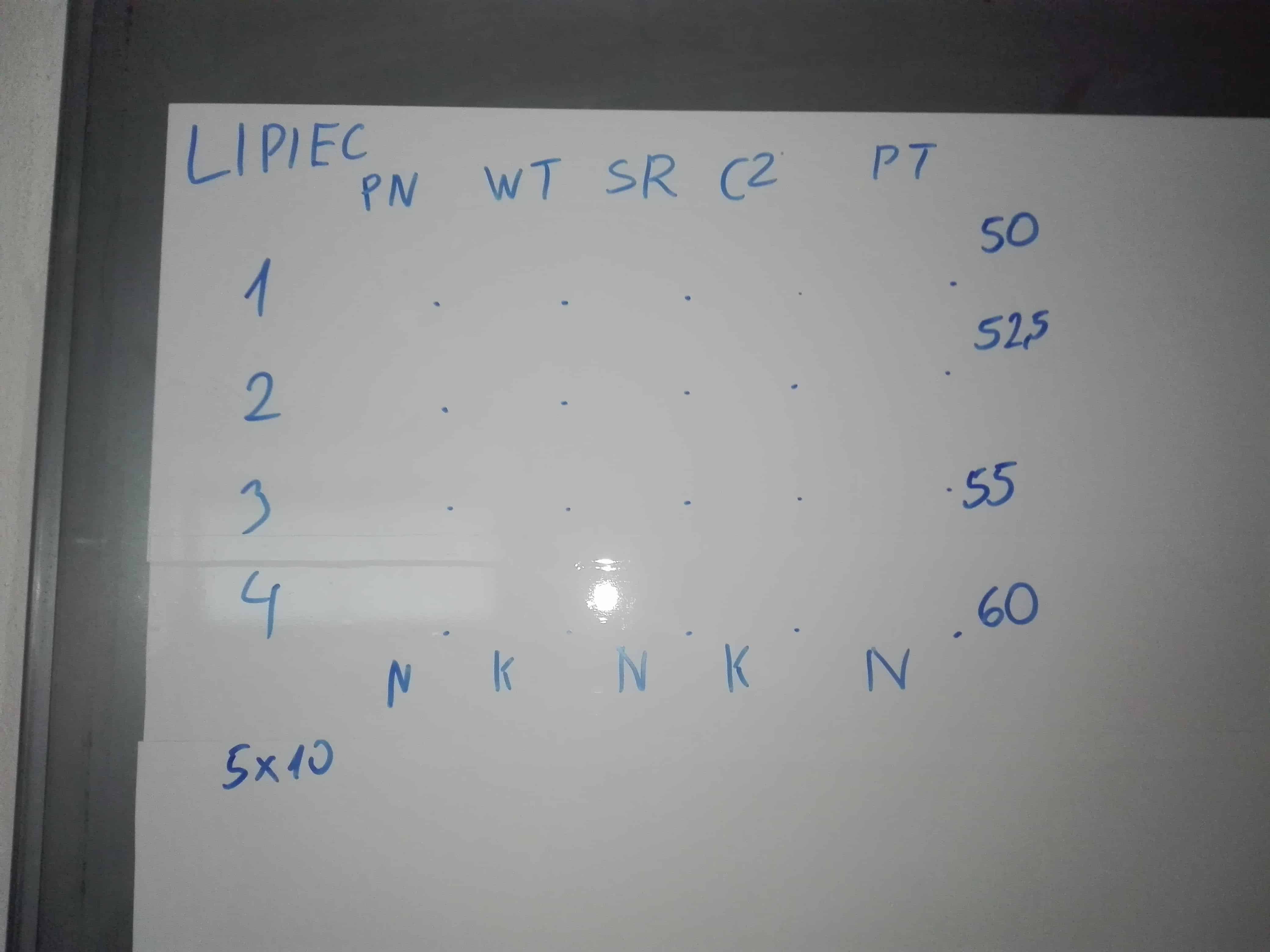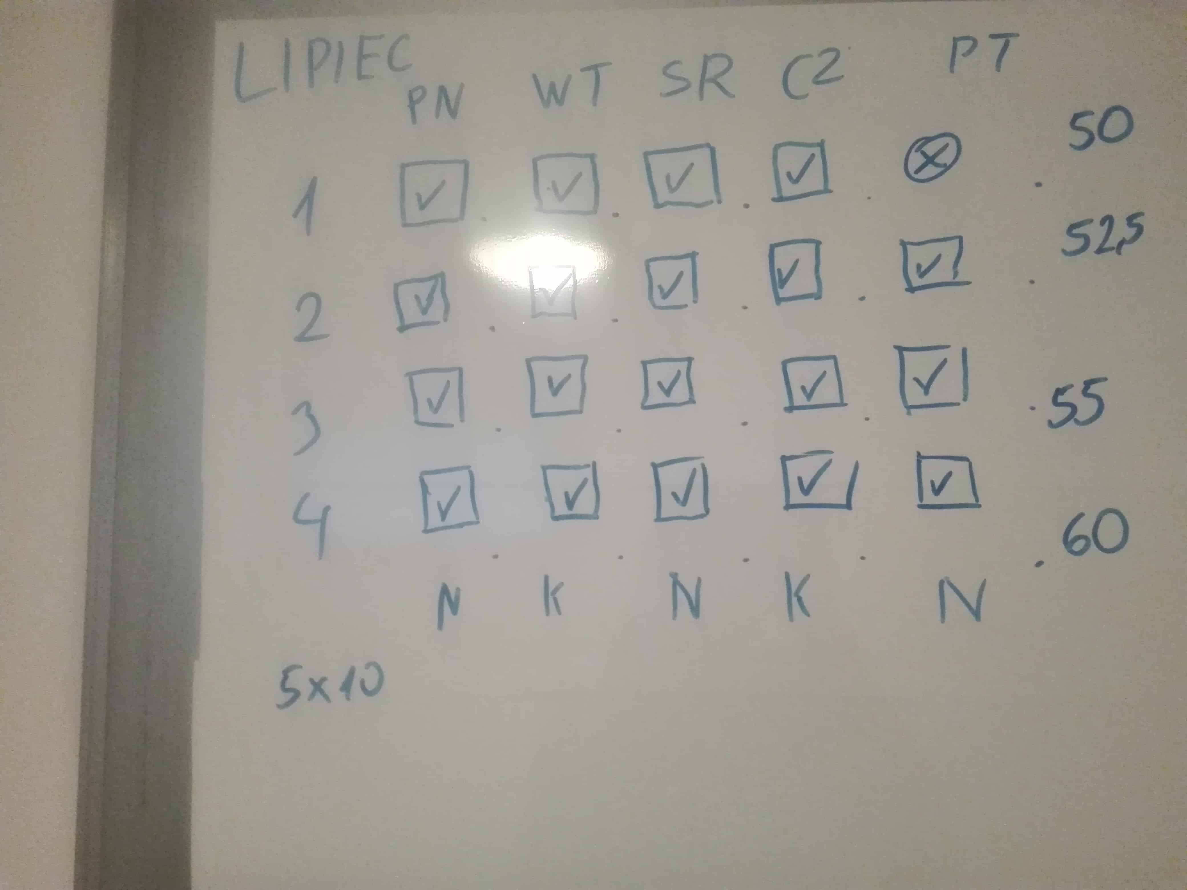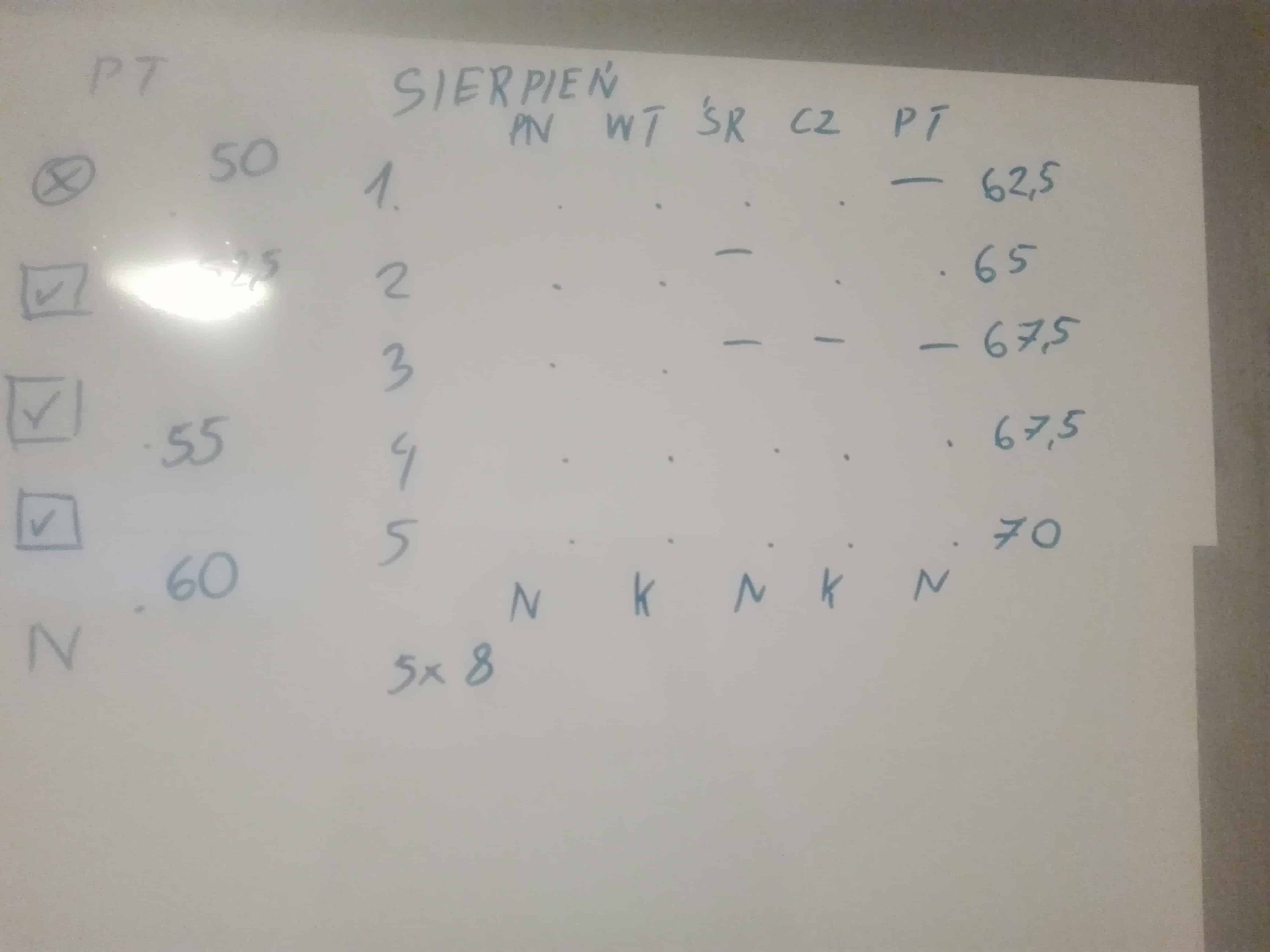 Z kłopotami, bo już w pierwszym tygodniu odpuściłem trening (z niewiadomego mi powodu), minął lipiec. Niewykonany trening oznaczyłem go dużym, paskudnym X. W przyszłości wykorzystam do tego czerwony marker, niech kłuje w oczy, niech rani serce i moją męską dumę! Nawet nie wiecie, jak bardzo motywująco wpływała na mnie myśl, że na tej pięknej tablicy będzie dużo IKSÓW!!! Mobilizowałem się więc bardzo, aby przede wszystkim pójść na trening następnego dnia.