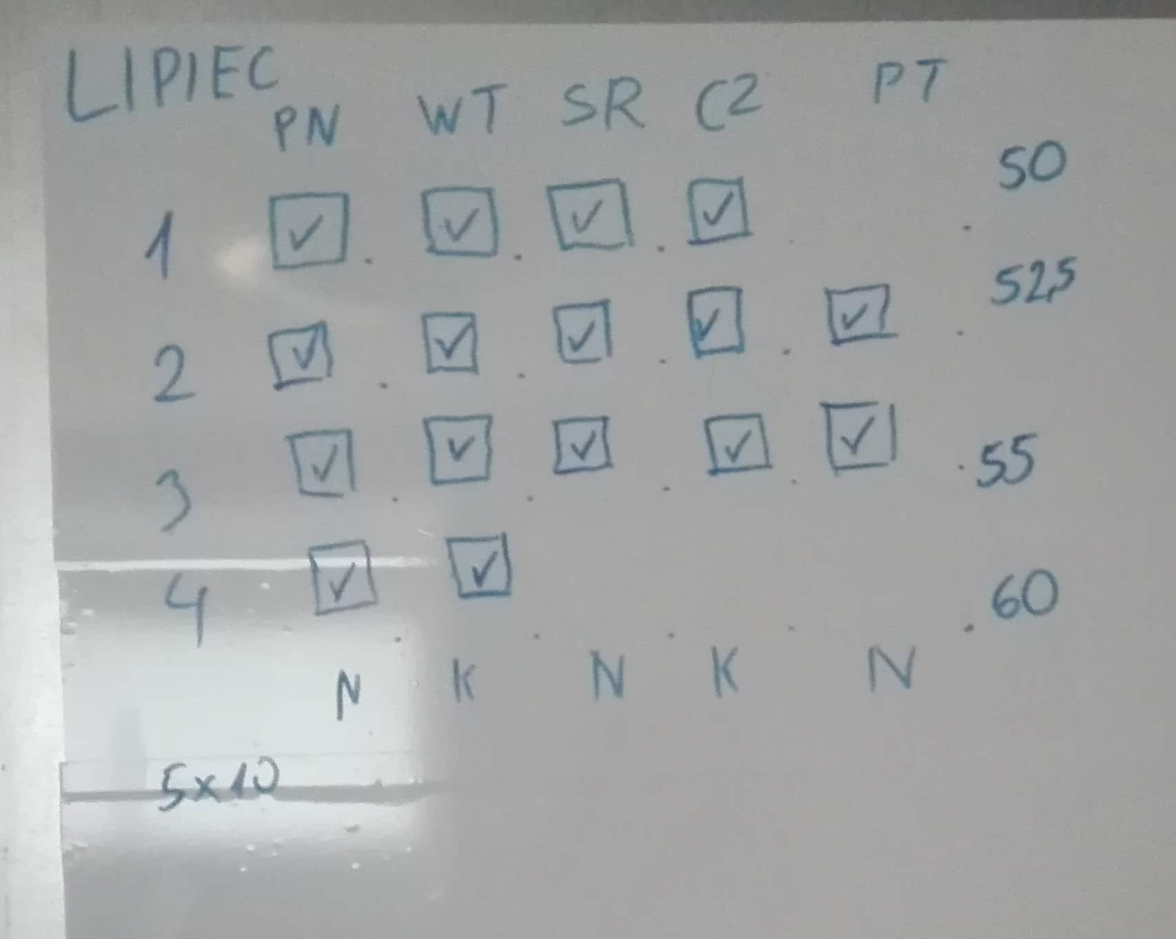Trenowanie. Dzwonił budzik, więc brałem rzeczy i szedłem na siłownię. A potem każdy trening oznaczałem ptaszkiem w kwadracie. Dlaczego taki znak? Składa się on z 5 pociągnięć markera — 4 na kwadrat i piąta na ptaszek — czyli tyle, ile robiłem serii. A ptaszek był pięknym przypieczętowaniem wykonania treningu! Jak widać, nie było z regularnością tak źle.